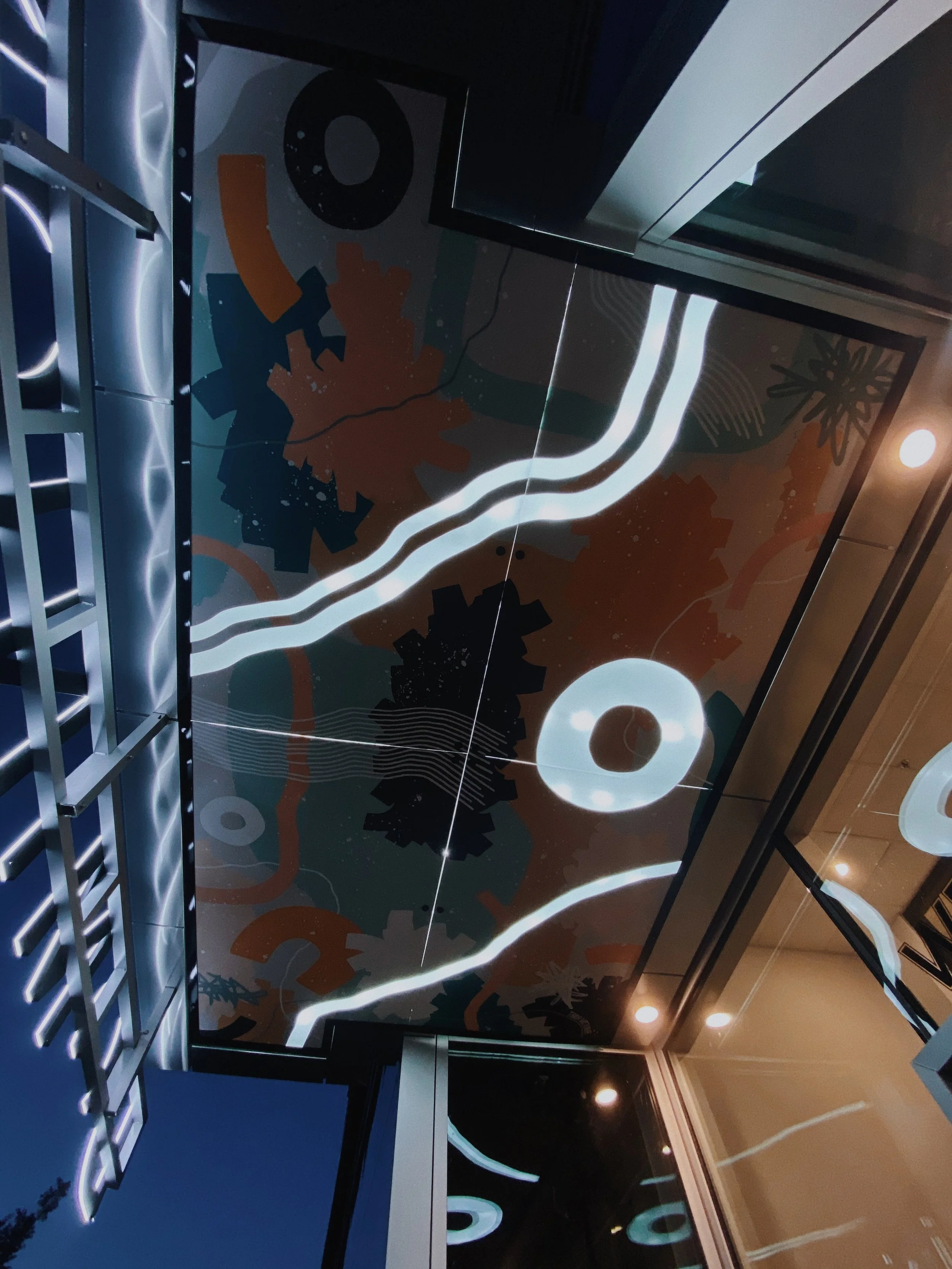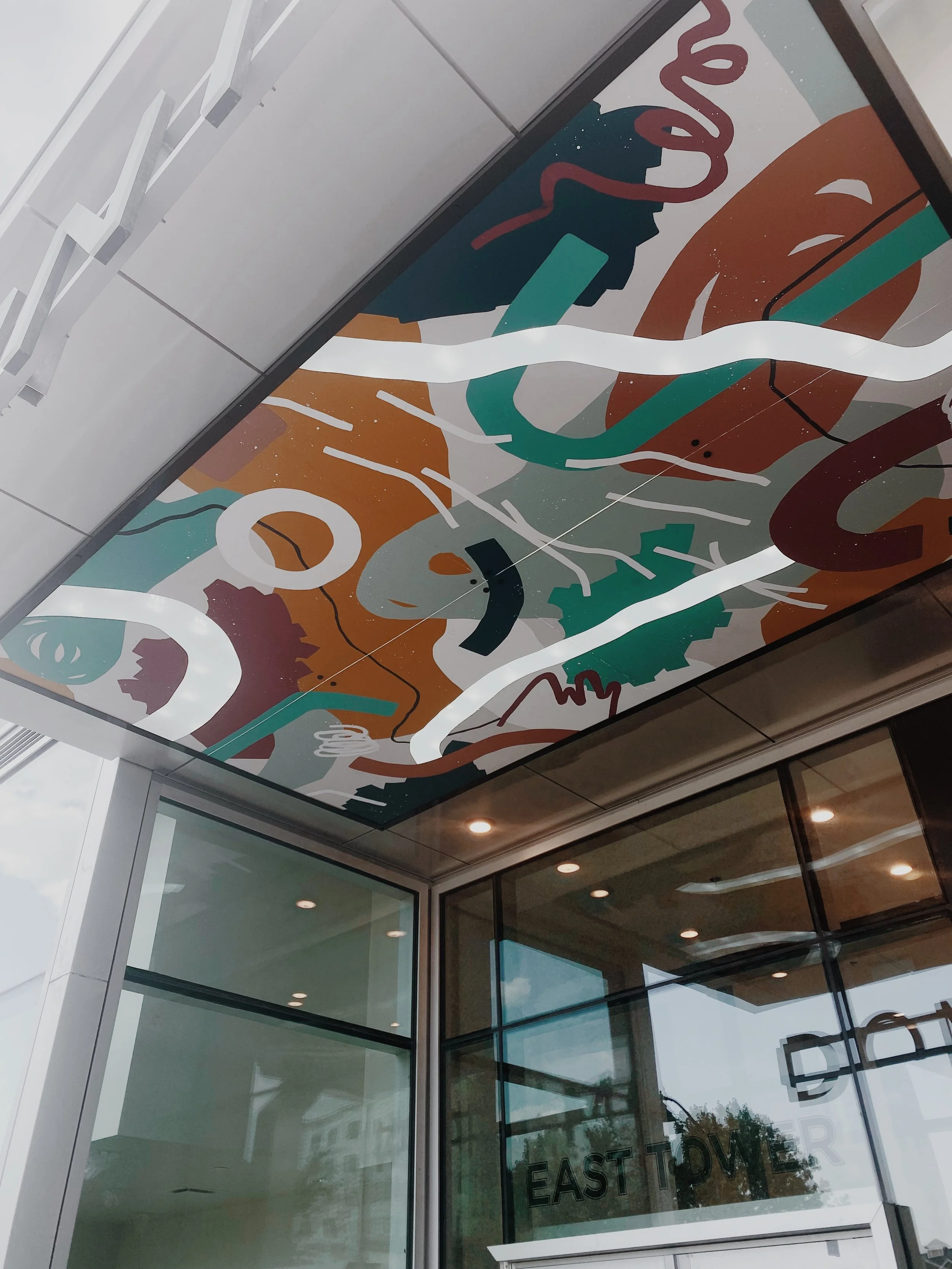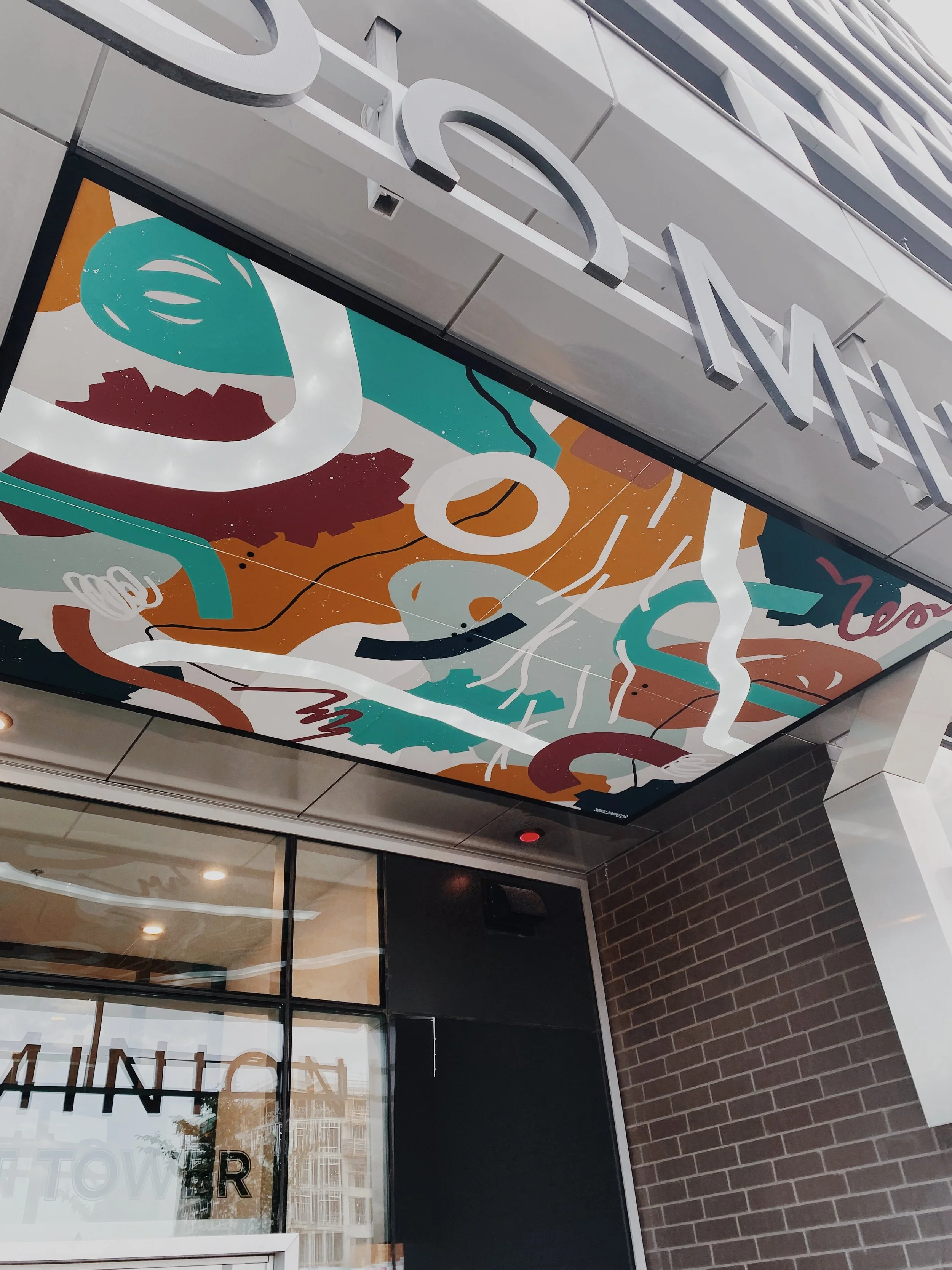 I painted a custom mural at the entrance of the West Tower, creating an elevated, welcoming entrance way. When the East Tower was completed, I was invited back to create a second mural that offered a unique design while maintaining a sense of continuity with the first, tying the two towers together through visual storytelling. Both murals are backlit, allowing me to intentionally play with transparency using shapes that allow light to shine through in key areas, creating a dynamic, ever-changing interaction with the environment. The theme of the murals was to encourage people to pause, look up, and appreciate their surroundings.