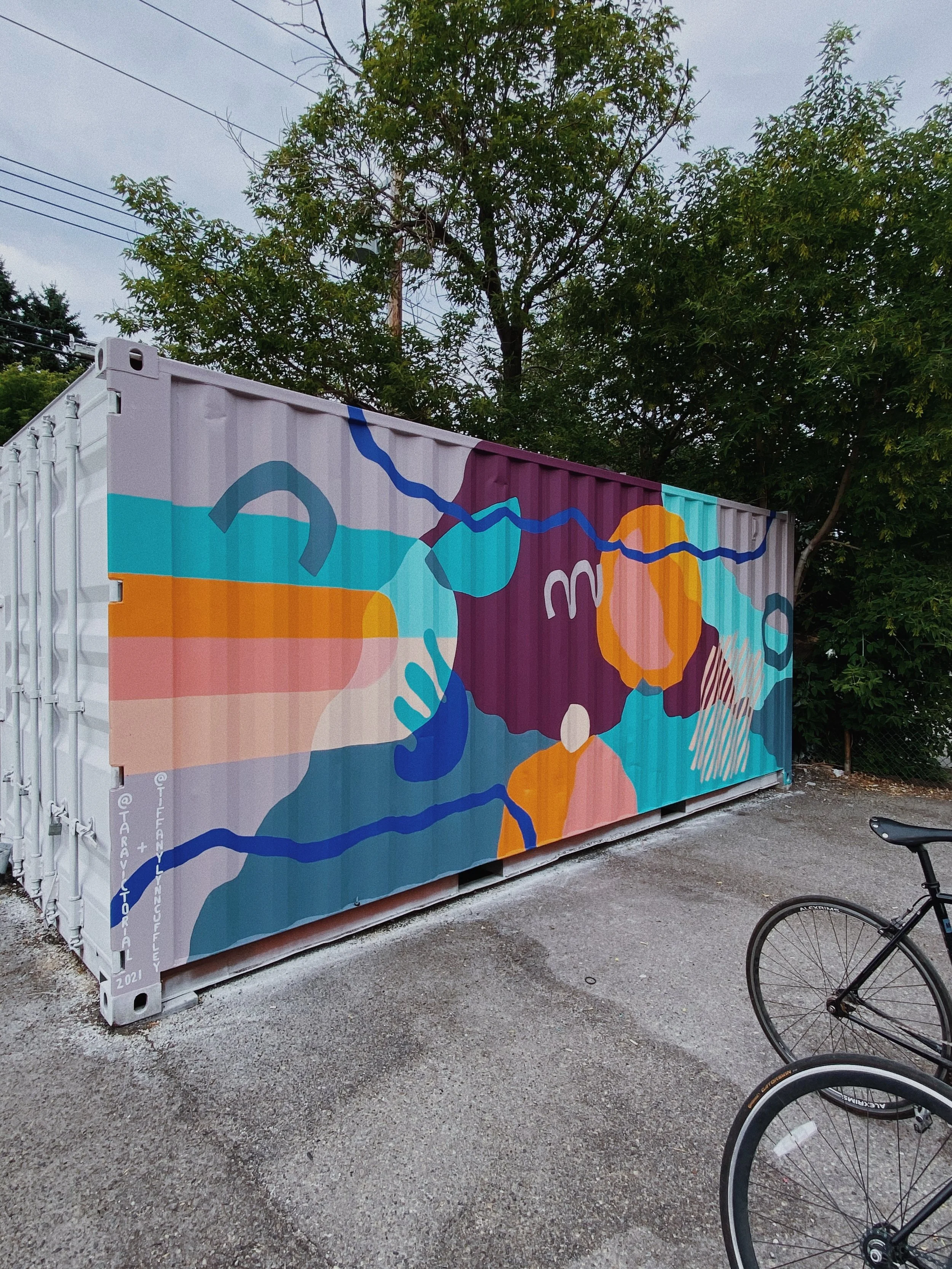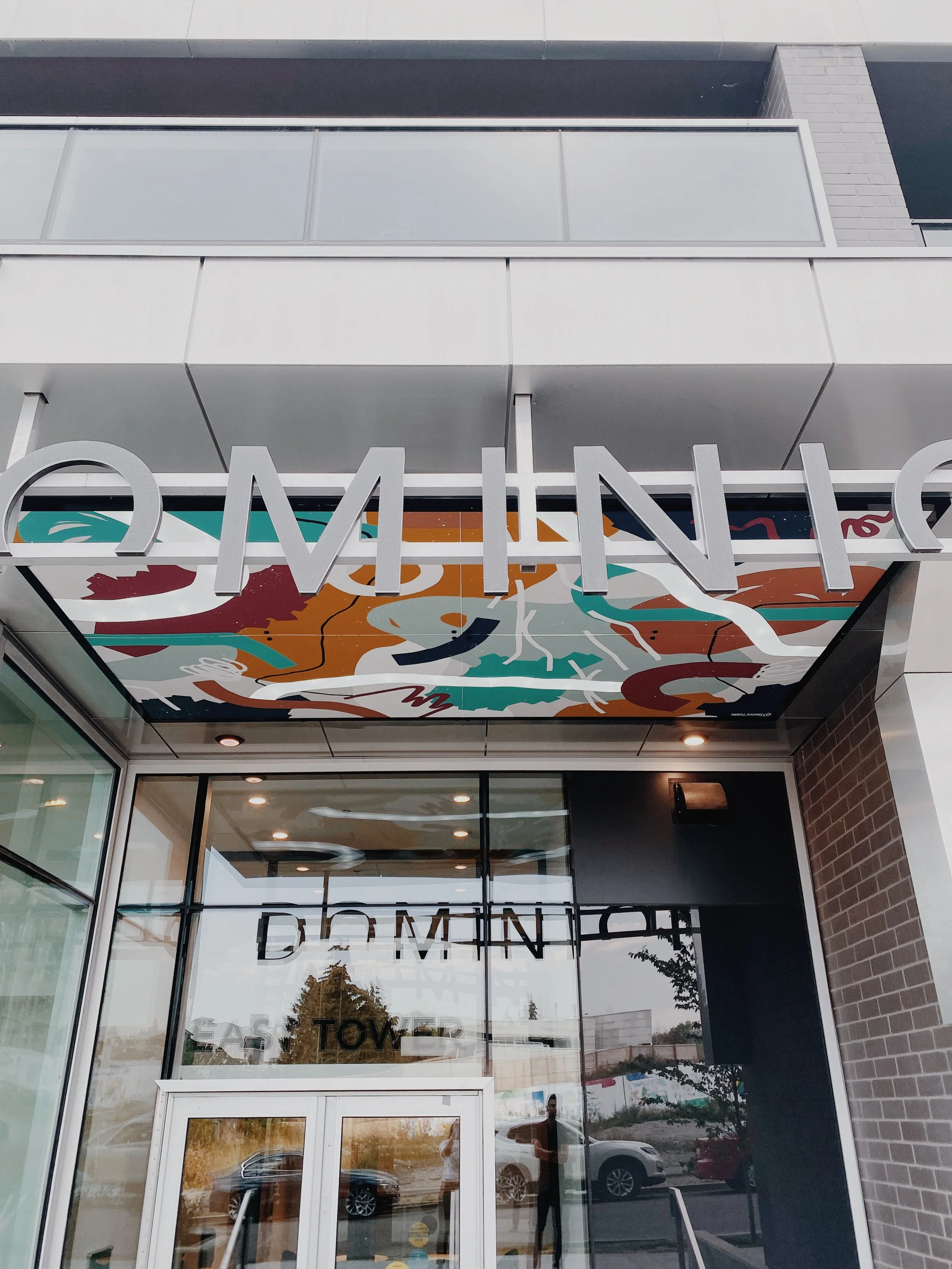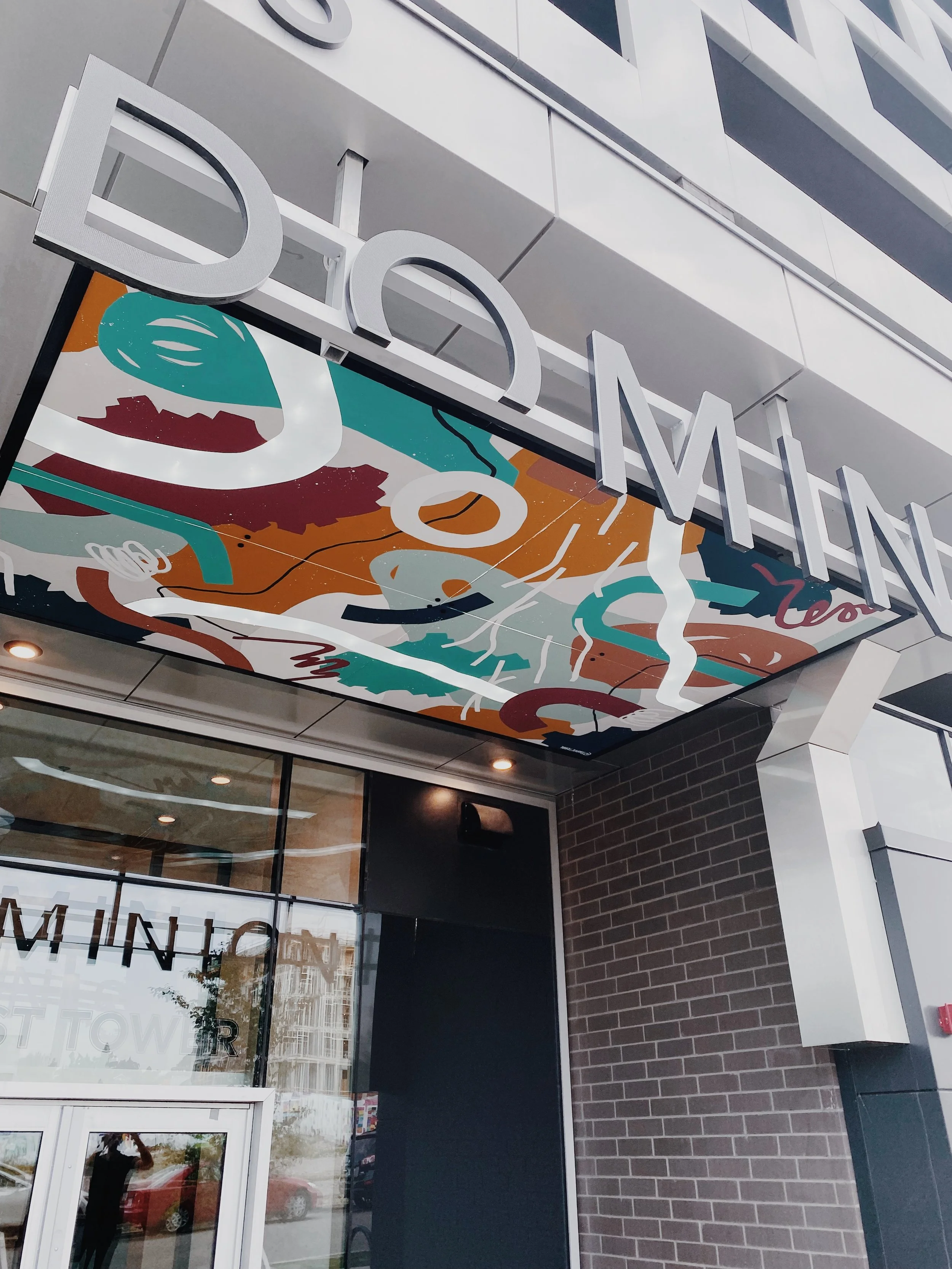 I painted a custom mural at the entrance of the West Tower, creating an elevated, welcoming entrance way. When the East Tower was completed, I was invited back to create a second mural that offered a unique design while maintaining a sense of continuity with the first, tying the two towers together through visual storytelling. Both murals are backlit, allowing me to intentionally play with transparency using shapes that allow light to shine through in key areas, creating a dynamic, ever-changing interaction with the environment. The theme of the murals was to encourage people to pause, look up, and appreciate their surroundings.